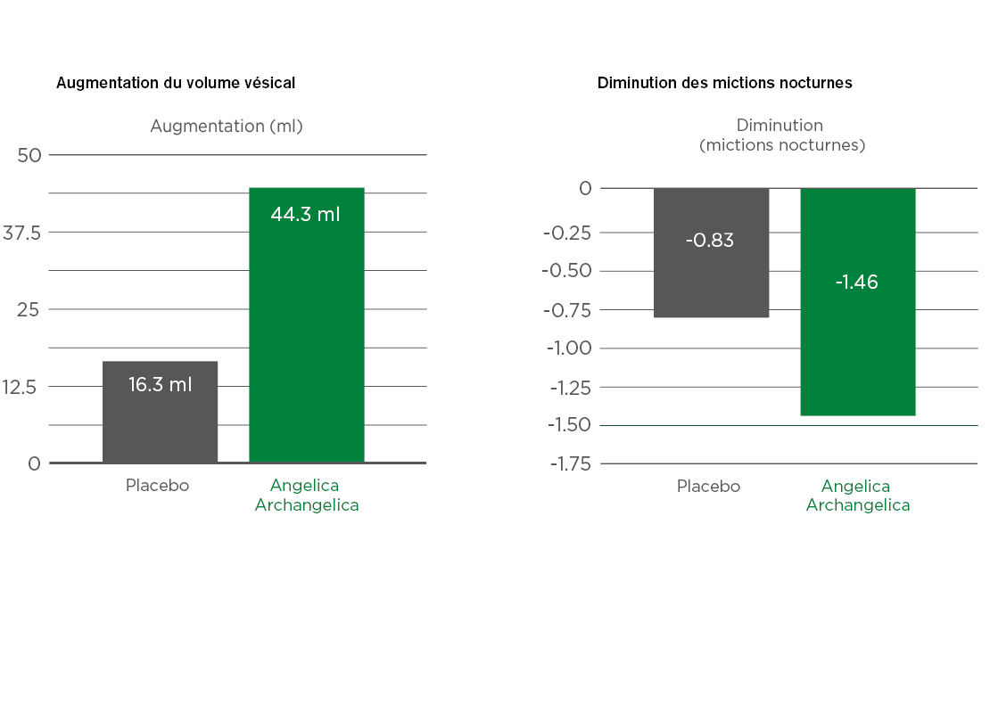 Cette étude randomisée en double aveugle a examiné l'effet de SagaPro, un extrait d'Angelica archangelica, sur le besoin nocturne d'uriner chez les hommes. Alors qu'aucune différence significative par rapport au placebo n'a été observée dans l'ensemble du groupe, l'analyse des sous-groupes chez les hommes présentant une capacité vésicale nocturne réduite (indice NBC > 1,3) a montré une réduction significative du nombre de mictions nocturnes ainsi qu'une augmentation du volume vésical fonctionnel. SagaPro pourrait donc être particulièrement utile pour les patients présentant une capacité de stockage vésical nocturne réduite.